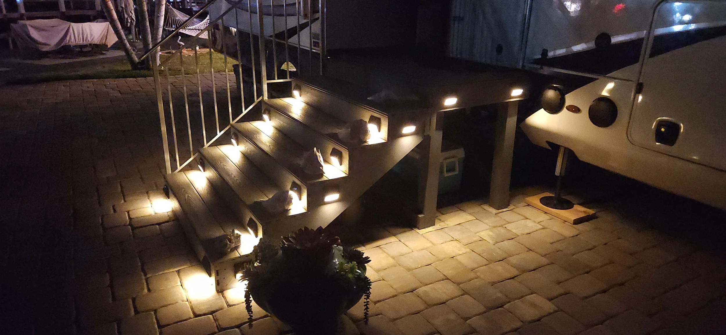 RV Steps & Landing These steps were made from treated wood and composite deck boards. The accent lights add a nice touch at night and illuminates the stairs well.